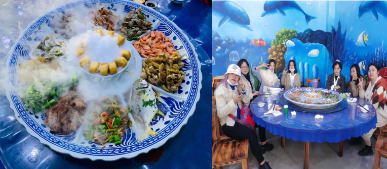 一路上歡聲笑語,忘卻了坐車帶來的疲憊。終于歷經(jīng)兩個(gè)小時(shí)車程的我們到了惠州-巽寮灣-中國版馬爾代夫,相信小伙伴們的肚子已經(jīng)在表示抗議了,那就讓我們來品嘗“青花瓷海鮮大盤菜”——采用當(dāng)?shù)貍鹘y(tǒng)烹飪煮法和干冰的澆灌,保持海鮮的美味,融匯出一種特有的滋味,使其成為一道美味佳肴!看到這里是不是覺得我們吃不完,那你們就想錯了,我們的戰(zhàn)斗力還是一級棒的,很快就把美食”洗劫而空”!